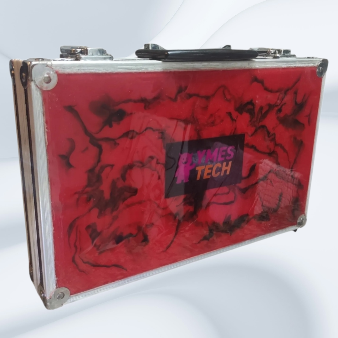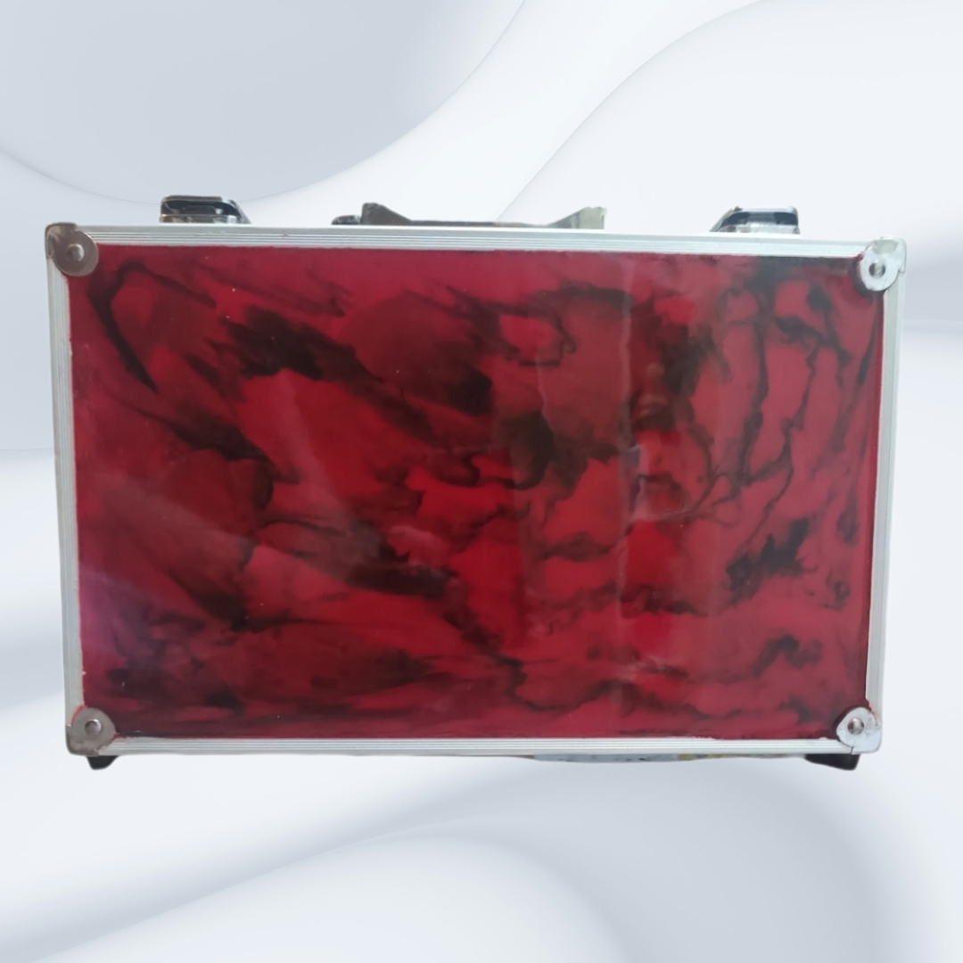 Maletín de entretenimiento realizado a mano. Perfiles de aluminio, herrajes inoxidables. Interior en vinilo de fibra de carbono. Baño exterior en resina cristal. Color rojo marmolado en negro.